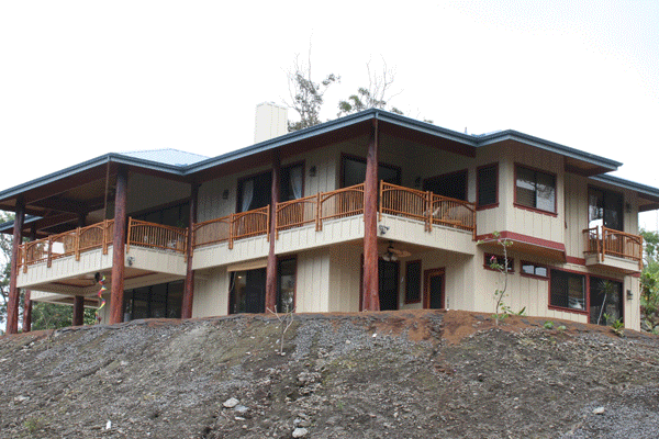 The Bennett residence was originally intended to be a spec house like its neighbor, but as it was being built, George Bennett grew so attached to it that he decided to purchase it for personal use. It is a very large house, with five bedrooms and six bathroms, totaling over five thousand square feet of living space, in addition to the three thousand square feet of lanais and the five hundred square foot garage. Trunks from the property's ohia trees were used as supporting columns all throughout the house, which, along with the interior decorations and a fountain/planter in the living room, containing orchids and other plants, give the house a tropical feel. Enormous sliding doors open up to the high-ceilinged living room up, giving the house a unified, airy feeling.